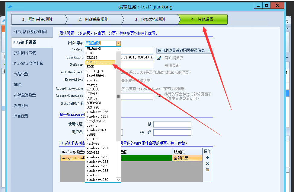 火车头下载中文名图片出错解决办法:在火车头任务编辑–其他设置-Http请求设置–中将网页编码改为UTF-8即可。