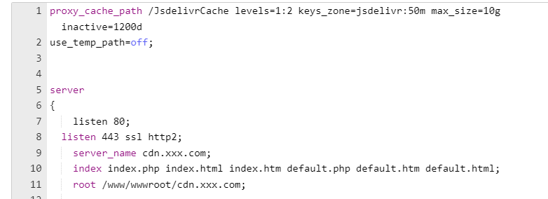 proxy_cache_valid 200 365d; 表示缓存状态码和过期时间,这里只缓存200的请求,并且缓存一年时间,1年之后缓存过期nginx会再次访问Jsdelivr,如果后端静态文件更新不频繁建议设置成一个较大的值,更新频繁缓存时间可以设置小一点。
