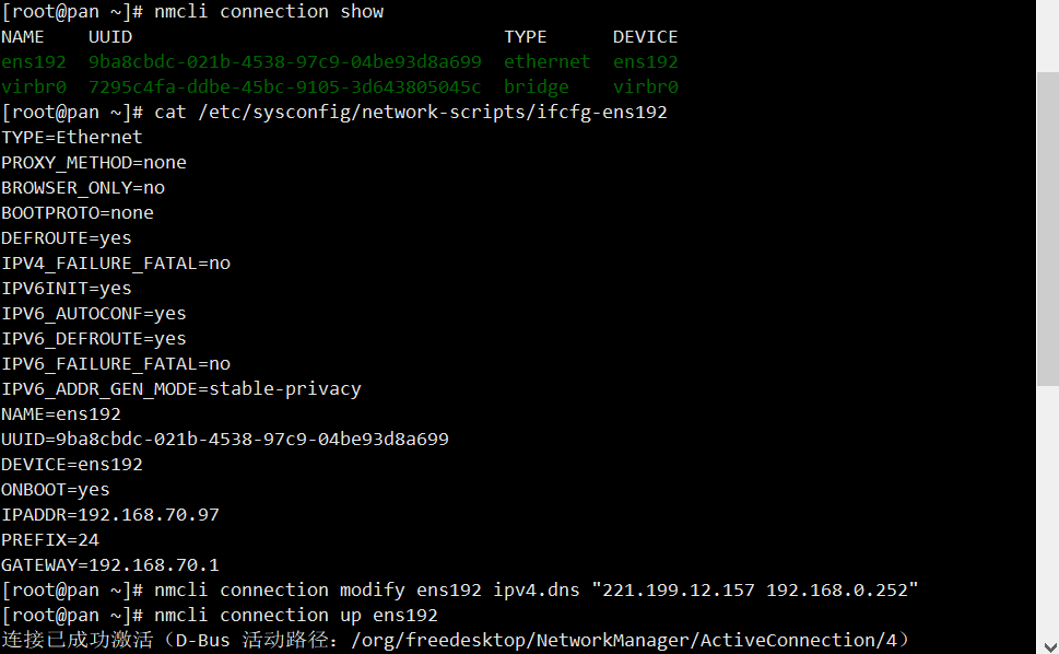 nmcli connection modify ens192 ipv4.dns "221.199.12.157 192.168.0.252"